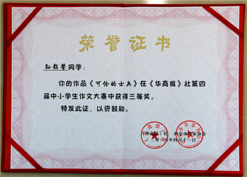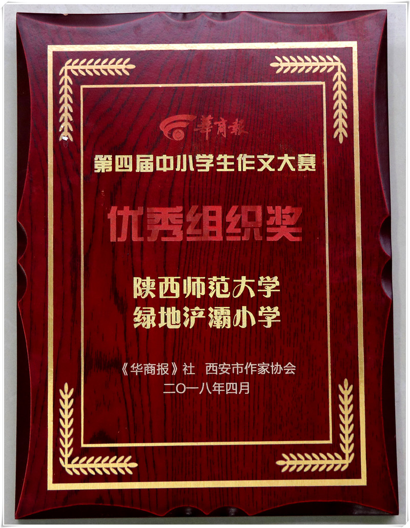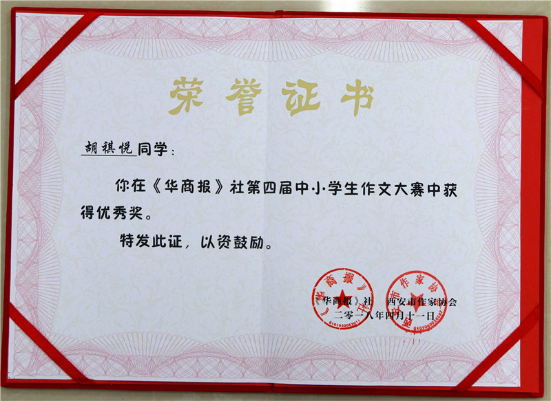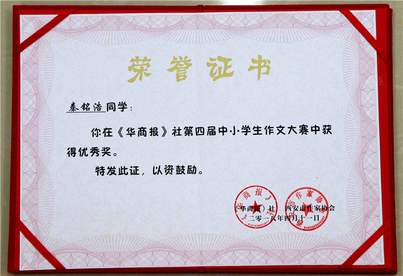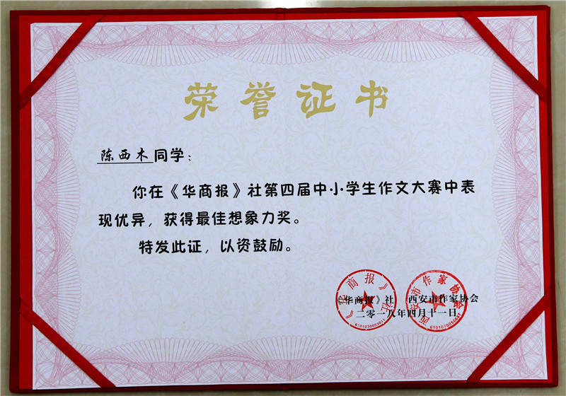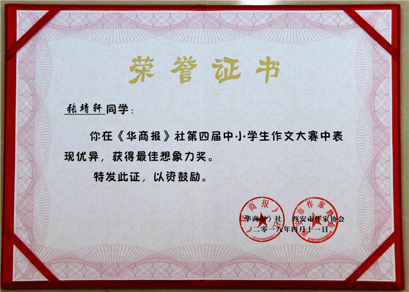 在华商报第四届中小学生作文大赛中,我校成绩喜人——孙颢馨同学荣获三等奖及奖金,陈西木 、张靖轩同学荣获“最佳想象力奖”及奖金,四年级胡祺悦、秦铭浩同学荣获优胜奖。我校被授予“优秀组织奖”。