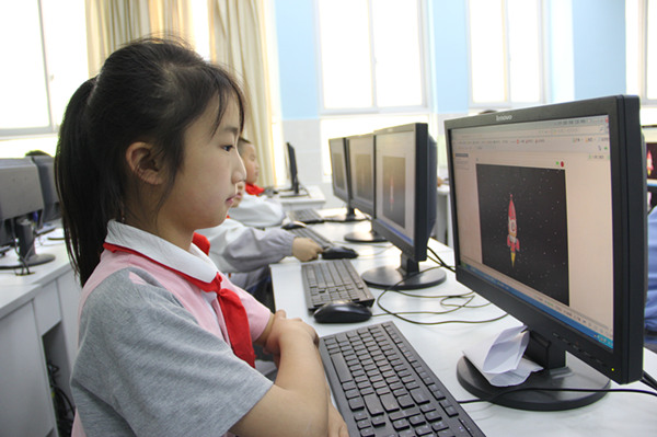 多媒体大课堂社团现有学生38人,主要来自于小学二至四年级学生。考虑到大部分学生电脑操作水平和学习兴趣,本学期多媒体大课堂社团的主要教学内容是趣味编程—Scratch。 作为一种可视化、积木式的创作工具,学生只需拖拽图形化的指令码,即可创作属于自己的故事、动画、游戏和音乐等数字化作品。通过教学,该兴趣班的孩子们不仅认识Scratch小猫,还利用它制作了各种故事、动画以及各款好玩的小游戏!孩子们从一个游戏者变成了游戏设计者。孩子们的作品十分有趣、令人着迷。他们对Scratch的兴趣非常浓厚,瞧!孩子们学的时候多么专注。