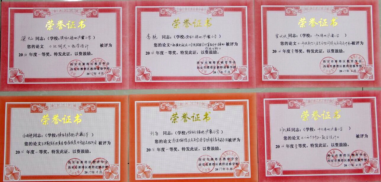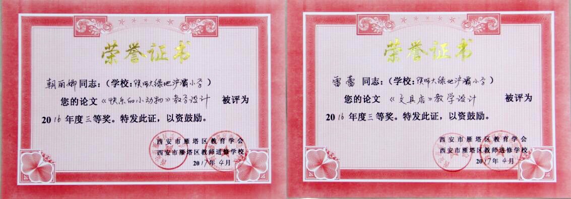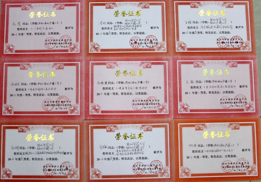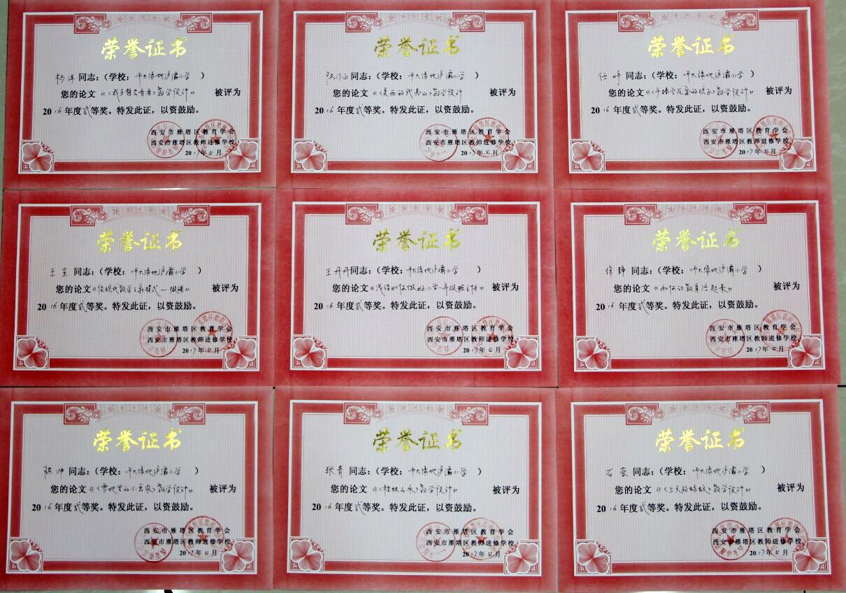 我校关注教师教育教学专业素养及业务水平的提高。建校以来,学校各方面取得了优异的成绩,获得了社会各界的认可,终品“万紫千红春满园”的意境。在2016年西安市雁塔区教育学会和西安市雁塔区教师进修学校共同举办的教师教学设计及论文大赛中,我校26名参赛教师全部获奖。